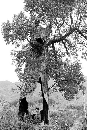 3月24日,游客参观浙源乡岭脚村小学前的“空心”古樟树。在江西婺源县浙源乡,有一棵直径3米多的古樟树,因遭雷击火烧,树干仅剩两片树皮,却依然郁郁葱葱,被当地人称为“树坚强”。目前,该树已被婺源县列为珍贵树木重点保护对象并进行挂牌保护。