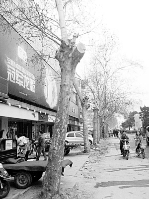 25日上午,记者离现场10多米远,就看到原来超过两三层楼高的法桐已被砍得光秃秃的(如图)。记者数了数,有13棵法桐遭“砍头”。