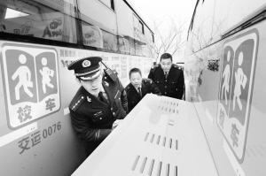 3月25日,青岛市崂山公安边防大队民警在对校车进行安全设备检查。近日,青岛市公安、交运等部门联合开展“安全无小事 车厢变课堂”活动。在加强校车安全检查和司乘人员安全培训的同时,在全市1500辆校车上张贴安全宣传材料并播放安全教育视频,向学生普及和宣传交通安全、消防逃生等知识。新华社记者 李紫恒 摄