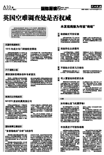 马来西亚总理纳吉布·拉扎克3月24日晚宣布,英国空难调查处与国际海事卫星组织根据对卫星数据的分析认为,马来西亚航空公司MH370航班最后的位置是在南印度洋。英国航空事故调查局,作为此次调查结果重要出处之一,隶属于英国交通部,职责是调查发生在英国、或与英国相关的空难和严重航空事件,曾参与多起严重空难的调查。英国方面说,这一机构以马航客机发动机生产商所在国的调查机构身份协助调查。