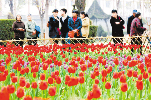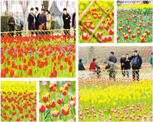 3月25日,游客在淮阳剪枝公园观赏盛开的郁金香。