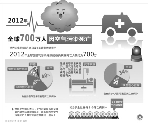 世界卫生组织3月25日说,2012年全世界共有约700万人死于空气污染。空气污染已成为威胁全球环境健康的最主要“杀手”。