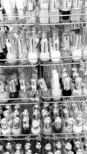 而商场内在售的指甲油,瓶身标注的信息相对完整,如生产日期、保质期、生产许可证号、卫生许可证号、执行标准、厂家名称等信息。但产品所含成分,上面却未显示。一瓶售价为89元的某品牌指甲油也未标注相关信息,而店员解释说,因为指甲油瓶子太小,写不下这么多东西。