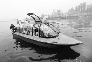 3月26日,广西柳州市市民乘坐试运行的“水上公交巴士”。