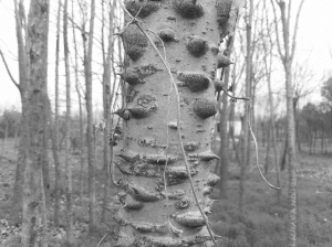 从高台上走下,记者继续行走在红花绿树之间,一棵浑身长满尖刺的大树吸引了记者的目光。只见该树有碗口粗细,全身长满了长刺,如果有人不小心碰到树干,非得扎出血来不可。“它的名字叫‘刺楸’,是我国稀有树种之一,十分罕见!”常年在森林公园看护树木的马松涛介绍,“夏天时,刺楸树上的每个刺旁边都会长出一片绿色的叶子,从远处看,整个树干被树叶包裹得严严实实。”
