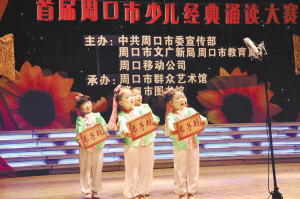 本报讯 悠悠民乐、朗朗诵读。3月28日晚,首届周口市少儿经典诵读大赛决赛在周口人民会堂“周末公益剧场”举行。来自商水县希望中学的史一博的个人朗诵和启明星语言艺术学校的团体朗诵在决赛中脱颖而出,获得金奖。据悉,由市委宣传部、市文广新局、市教育局主办,市图书馆、市群众艺术馆承办的首届周口市少儿经典诵读大赛决赛选出的12个节目,将代表周口参加2014年河南省少儿经典诵读大赛。