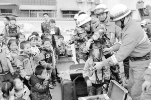 3月31日是全国中小学生安全教育日。当日上午,扶沟县消防大队官兵来到该县某幼儿园,给这里的200余名孩子及老师送上了一堂别开生面的消防安全教育课。在消防装备展示和体验活动中,小朋友们把消防官兵团团围住,好奇地问这问那,有的孩子还穿上消防员防护服,戴上头盔,煞有介事地敬了个军礼,活脱脱一个娃娃“消防兵”。晚报记者 朱东一 通讯员 马军海 摄