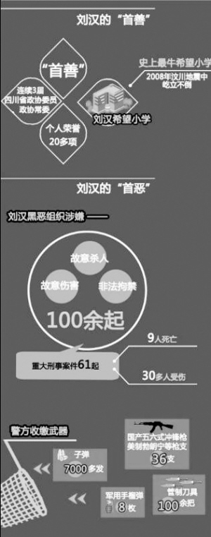 检方指控,1993年以来,被告人刘汉、刘维等36人无视国家法律,组织、领导、参加黑社会性质组织,大肆进行违法犯罪活动,攫取巨额经济利益,称霸一方,在四川省广汉、绵阳、什邡等地及部分行业内,形成非法控制和重大影响,严重破坏社会治安、经济和社会生活秩序。其中,故意杀人5起致6人死亡、故意伤害2起致2人死亡、非法拘禁1起致1人死亡。此外,被告人还千方百计拉拢腐蚀国家工作人员,寻求保护,巩固和扩张其社会影响力。咸宁市检察院指控,刘汉等人行为构成组织、领导、参加黑社会性质组织罪,故意杀人罪,故意伤害罪,非法拘禁罪,非法买卖枪支罪,非法持有枪支弹药罪,串通投标罪,非法经营罪,敲诈勒索罪,故意毁坏财物罪,妨害公务罪,寻衅滋事罪,开设赌场罪,窝藏罪,骗取贷款、票据承兑、金融票证罪等。