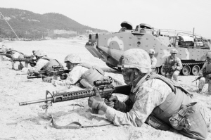 当日,韩美军方一年一度的大规模两栖登陆演习“双龙”向媒体开放。“双龙”登陆演习作为代号“秃鹫”的韩美联合军演的一部分,于3月27日至4月7日在韩国浦项附近进行。来自美国和韩国的上万名士兵参加演习,双方出动战舰、“鱼鹰”式偏转旋翼运输机以及CH-53型“海上种马”式直升机等武器装备。这是近年来韩美两国举行的规模最大的两栖登陆演习之一。 新华社记者 宋成锋 摄