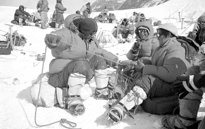 图为1975年5月,登山队副队长、藏族女运动员潘多(右一)与队员在海拔7007米北坳顶部的营地整理登山装备。