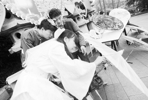 4月2日,一对装扮成白娘子和许仙的情侣在油纸伞上穿花线体验“伞下情缘”。当日是农历三月初三,是中国古老的传统节日上巳节,也被称之为古代情人节。浙江杭州雷峰塔景区邀请30多对夫妻和情侣来景区体验“千里姻缘一线牵”“同舟共渡”“伞下情缘”等,让他们在活动中过一个浪漫的“三月三”。