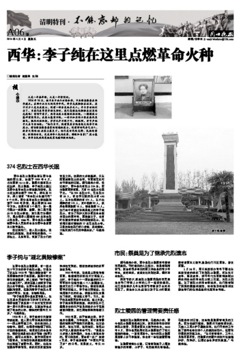“李子纯是西华县东夏亭镇人,他在武昌农民运动讲习所学习归来后,领导创建了我县第一个农村党支部和第一届中共西华县委,在豫东率先点燃了革命的火种,牺牲的时候年仅33岁。”马建伟说。