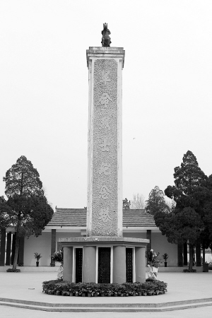 距离陵园大门50米处,一座高十几米、钢筋水泥结构的纪念塔巍峨耸立,纪念塔最顶端是一尊战士持枪跃马的雕像。塔身呈四棱四面立体结构,除正对陵园大门的西面雕刻着“革命烈士纪念塔”7个遒劲大字外,南、东、北三面还分别雕刻着“为祖国为人民光荣牺牲”、“人民英雄永垂不朽”和“革命的先烈,英雄的事迹”塔文。