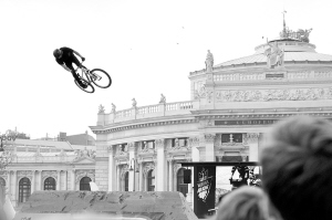当地时间4月6日,一名选手在特技赛中。当日,在奥地利首都维也纳市政厅广场,2014维也纳自行车节上演“空中之王”自行车特技赛。