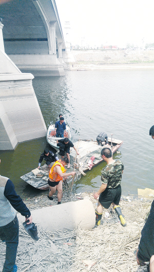 12时20分,记者来到事发现场,看到桥上和河岸边站着很多围观的市民,消防官兵和民警及热心市民正用两艘小船在河里打捞男子。跳河男子的女友在河边哭个不停。