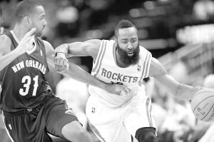当地时间4月12日,火箭队球员哈登(右)在比赛中进攻。当日,在2013-2014赛季NBA常规赛中,休斯敦火箭队主场以111∶104战胜新奥尔良鹈鹕队。