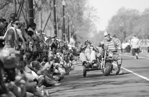 4月12日,在美国首都华盛顿市中心,两名小丑参加一年一度的樱花节大游行。