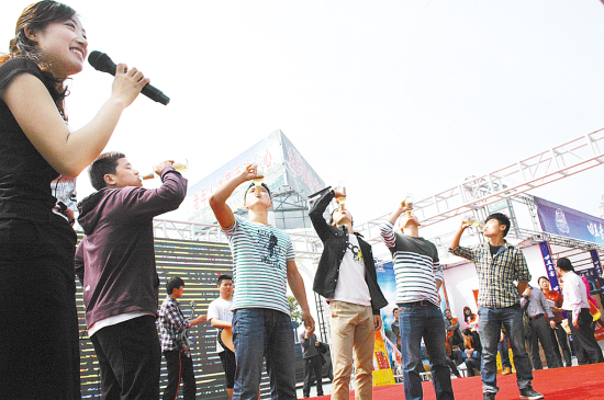 2014酒水博览会期间,“华雪啤酒杯”速饮大赛现场火爆,4天时间内,河南华雪啤酒有限公司通过速饮大赛,向市民送出了近500箱啤酒。与比赛同时进行的免费品尝啤酒和买一赠一活动,也吸引了大量市民参与。图为比赛现场。本报记者 张建中 摄