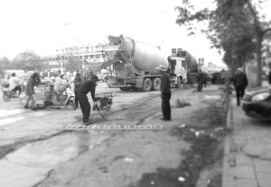 周口市区大庆路供水管网改造以来,对一些路面进行了开挖,给市民出行带来不便。4月13日17时许,记者在现场看到,两辆水泥罐车正在往开挖的路面倾倒混凝土,对开挖路面进行修复。晚报记者 张志新 摄