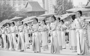 4月14日, 一些傣族姑娘准备跳傣族伞舞。