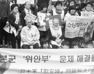 4月16日,在韩国首尔,两名二战期间被迫充当日军“慰安妇”的韩国老人参加抗议集会,呼吁日本政府尽快解决慰安妇问题。