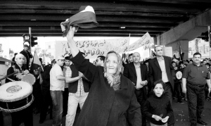 4月16日,在叙利亚首都大马士革,一位老人在活动现场振臂高呼,支持叙利亚现政府。