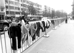 4月17日,记者在周口市区七一东路看到,主干道的护栏上晾晒了许多衣服,非常不雅观。居住在附近的张先生说:“衣服应该是附近商户晾晒的。在护栏上晾晒衣服影响城市形象,希望有关部门能管一管。”晚报记者 张志新 摄