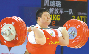 4月20日,解放军一队选手周璐璐在挺举比赛中。当日,在河北迁安举行的2014年全国女子举重锦标赛暨亚运会选拔赛75公斤以上级比赛中,周璐璐以抓举142公斤、挺举181公斤和总成绩323公斤包揽三项冠军。