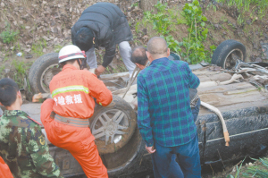 在事发现场,公路左侧有四道非常明显的刹车痕迹,轿车翻在河沟里,河沟里的水约有半米深。由于轿车车顶挤压变形,车门玻璃以下淹没在水里,车门无法打开,司机被困在车内(如图)。“幸亏水不深,不然危险得很。”目击者说。