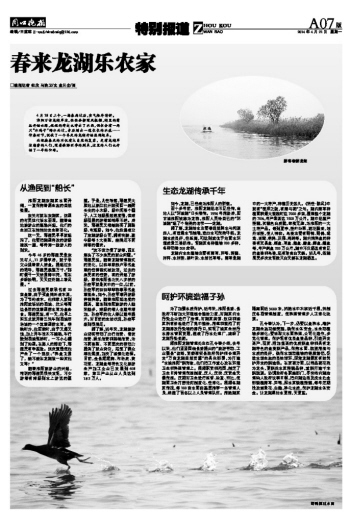 淮阳万亩龙湖岸边,依依垂柳随风轻摆,湖里的蒲丛开始吐绿,嫩嫩的荷尖也浮出了水面,偶尔会有一两只“水鸡子”踏水而过,身后划出一道长长的水痕……仲春时节,沉寂了一个冬天的龙湖开始热闹起来。