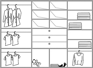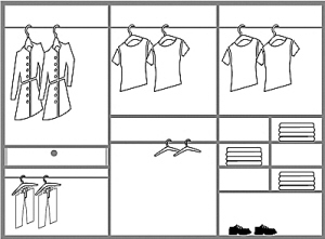 年轻人衣服多,为了便于找寻,除去必要的叠放区和置物空间,尽量多配置挂衣空间,分别将短衣、长衣、裤子分开放置。