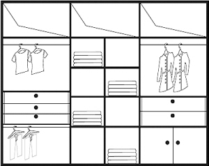 首饰盒、格子架是皮带、袜子、领带、丝巾等小件物品专门收纳的地方,往往设计在衣柜中间,方便拿取。如果空间有限,可以将中间的抽屉加格架实现多功能使用。考虑到女士的鞋子较多、或者有经常出差的习惯,底部空间可以因人而异设计出鞋柜或行李箱存放区。
