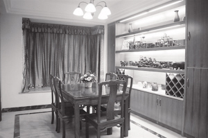 新居中,陆女士最喜欢的,莫过于客厅和餐厅。“就是我想要的样子。”陆女士说,红木的餐桌和沙发,都是精挑细选。红木沙发有吉祥如意的寓意,而餐桌椅线条优美,两者与空间的比例均很得当。餐边柜,因为有了内置光源的衬托,上边的装饰摆件更显得抢眼了。