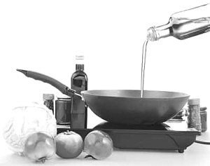 旺油锅。俗称“七八成热”,约190°C~240°C,此时油面的翻动转向平静,有青烟,用勺搅动时有声响。原料下油锅后,周围出现大量气泡,并带有轻微的油爆声。一般适用于炸、烹、炒等烹调方法。