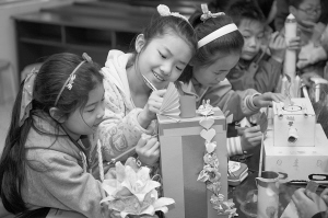 4月21日,合肥常胜小学的学生在用废旧物品制作手工作品。