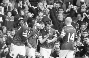 当地时间4月20日,埃弗顿队球员庆祝进球。当日,在英格兰足球超级联赛第35轮比赛中,埃弗顿队主场以2∶0战胜曼彻斯特联队。