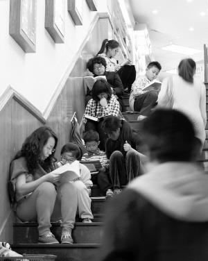 2014年4月18日晚,在北京三联韬奋书店,人们坐在通往地下一层的楼梯上读书。这个楼梯以及坐于其上沉浸在书海中的读者,是这间书店标志性的风景之一。