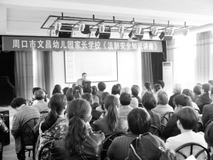 昨日下午,周口市文昌幼儿园邀请相关专家来到校园,举办法制安全知识讲座,为该园全体学生家长讲授与学生校园内外安全相关的法律知识。晚报记者 宋风 摄