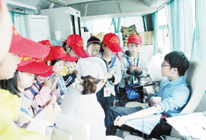 “这是心的呼唤,这是爱的奉献……只要人人都献出一点爱,世界将变成美好的人间。”接下来,小记者们一同乘车赶到人民商场附近,这里的工作人员正在无偿献血车上紧张有序地忙碌着,不时有无偿献血者上车献血。
