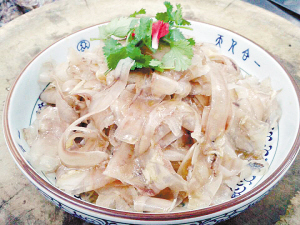 上菜时取自然化冻的牛鞭片250g,加入盐4g、饱和味精水10g、陈醋20g、蒜泥20g、香油20g拌匀即可装盘,用香菜和鲜花点缀。