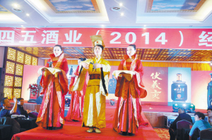 新产品发布会是每年经销商关注的焦点,今年发布的新产品是其新研制的高端佳酿——伏羲贡酒及婚庆用酒类的绵柔四五老窖,酒模现场进行了新品展示(如图)。