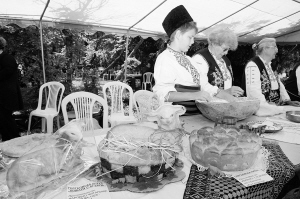 5月3日,在保加利亚里亚斯科维茨市举办的牧羊人博览会上,身穿传统服饰的当地人展示小羊羔造型的蛋糕。