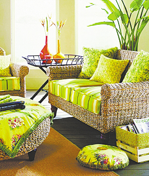 具有稳定情绪作用的绿色,常被人们用来装饰居室。它和蓝色一样具有视觉收缩的效果,房间里不会产生压迫感,也不会产生温度差异的感觉。配色方法是将自然的颜色统一,用稍稍明亮的色调营造出祥和的气氛。在室内,以浑浊感少,较明亮的绿色为配色,会有眼前一亮的感觉。