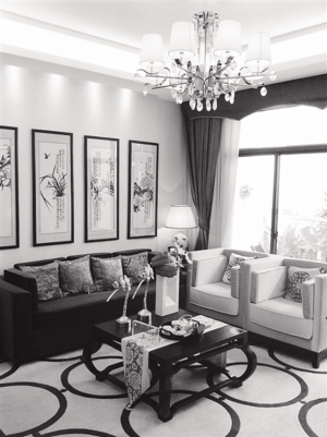在某楼盘的样板房中,设计师精心搭配了软装。记者看到,电视背景墙是古典的梅花壁画,沙发则是传统的四联国画,而茶几也是浓浓中式风格,但上方搭配的水晶吊灯,并没有违和感。
