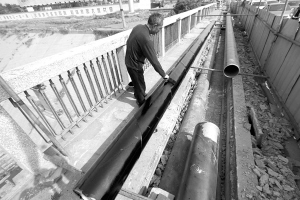 连日来,在周口市区中州大道大桥上,周口银龙水务有限公司施工人员一直加班加点更换输水管道。据施工人员介绍,原有的一根长240米的输水管道因使用年限已到,需要更换两根等口径、长240米的输水管道,以保障沙颍河以北居民用水需求。据悉,此工程预计本周内全部完成。