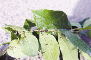 沿线一些门店的商户折断一枝树枝让记者看,所有树叶的正面沾满了这种透明状的液体,树叶背面和树枝上密密麻麻趴着一层黑色的小虫子(如图)。几位年长的市民称这是蚜虫,这种透明的液体是虫子的吸取树汁之后的分泌物。