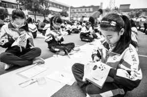 5月7日,天津市河北区天泰小学的学生们在操场上制作剪纸。