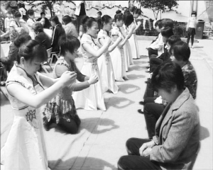 本报讯 “慈母手中线,游子身上衣……”在母亲节即将到来之际,商水县妇联在该县位集镇中心校幼儿园启动“关爱母亲月”活动。在启动仪式上,老师教学生给妈妈行跪拜礼。