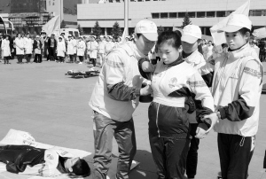 5月8日,呼和浩特市卫生学校学生在防灾减灾演练中对“伤员”实施紧急救护包扎。