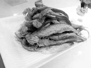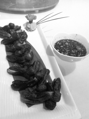 “杭州一口茄来喽!”服务员欢快地传上第一道,白色长瓷盘中一片碧绿的苇叶上摆放着一大串如紫黑色花蕾的小茄子,盘角点缀着黄绿菜叶和细苇叶做成的花,格外雅致。茄子娇小,清香四溢,蘸着蒜汁醅的作料吃,非常好吃。